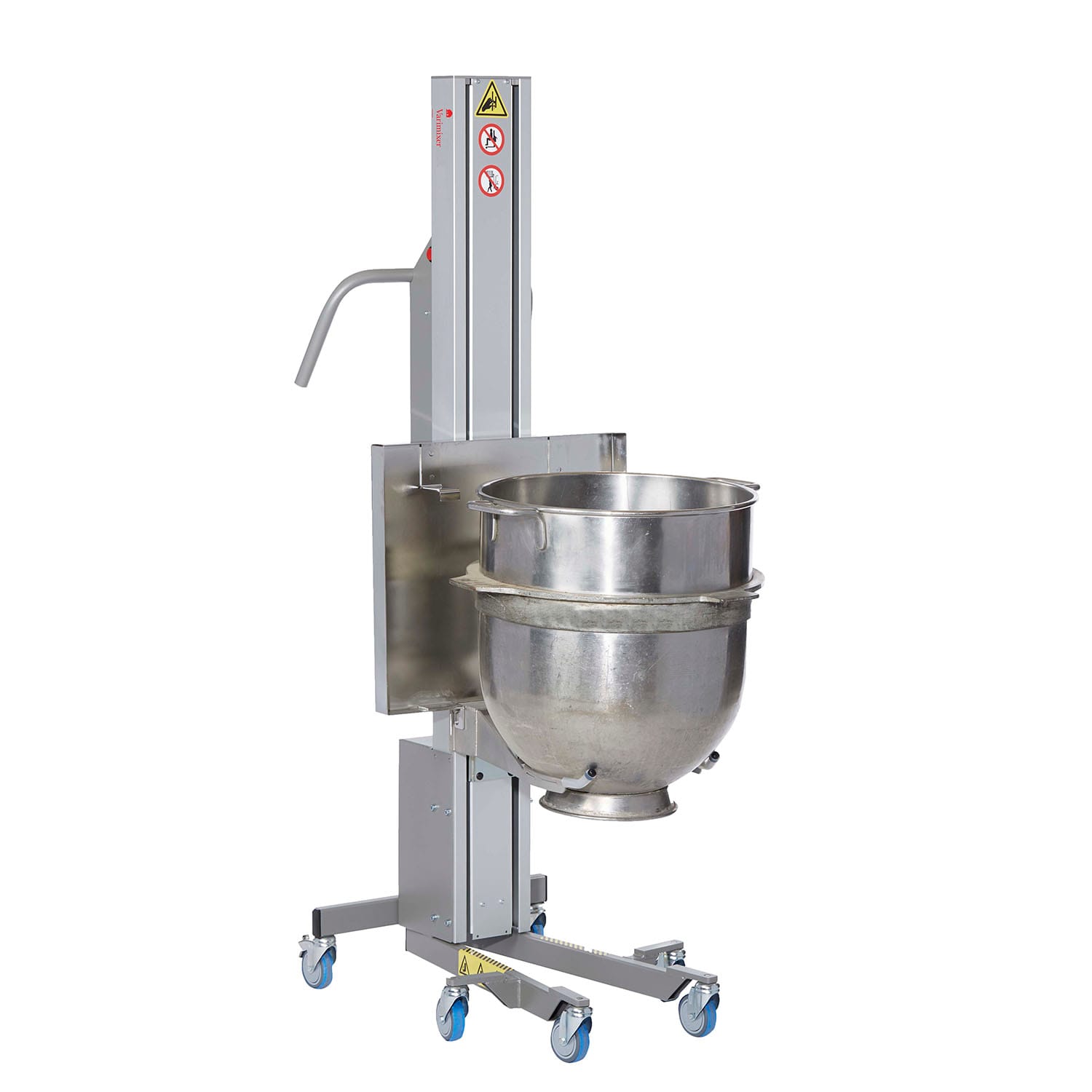 The bowl is wheeled into place between the two bowl arms. Using the handle – or automatically by pressing a button – the bowl is raised, centered and locked in place in a single movement.